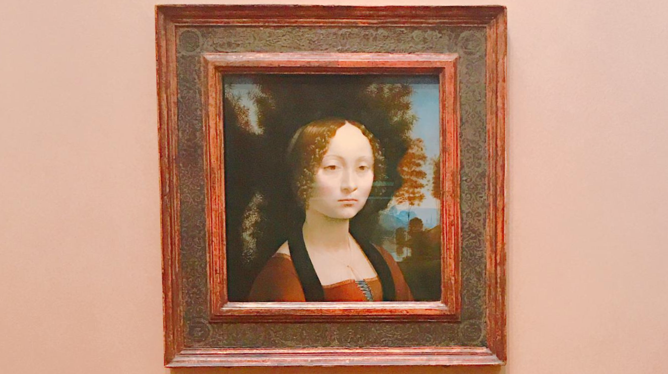 레오나르도 다빈치가 그린 이 초상화는 그의 대표작인 모나리자와 체칠리아 갈래라니등의 초상화 3점 중에서 가장 처음 그린 초상화로써 그의 작품 중 유일한 양면 그림입니다. 이 초상의 주인공인 지네브라 데 벤치는 15세기 이태리 피렌체의 메디치 가문 다음으로 부유했던 은행가 아메리고 다 벤치의 딸로서 아름다움과 지성을 겸비하여 수많은 예술가들의 흠모의 대상이었다고 합니다. 이 초상은 그녀와 유명 행정관이었던 루이지 리 콜리니의 결혼을 기념하기 위해 그려졌으며 앞면에는 지네브라의 초상이 뒷면에는 월계수와 야자잎에 둘러싸인 노간 나무 그림이 그려 있습니다. 노간 나무는 이탈리아어로 지네 프로, 즉 초상화 주인공인 그녀의 이름을 상징합니다. 또한 노간 나무를 둘러싸고 있는 리본에는 ‘미가 덕을 상징한다’라는 문구가 쓰여있어 그녀의 아름다움과 덕을 나타내고 있습니다. 특히 이 그림은 다빈치의 초기 작품으로써 미술사적 가치가 매우 높은 작품입니다.